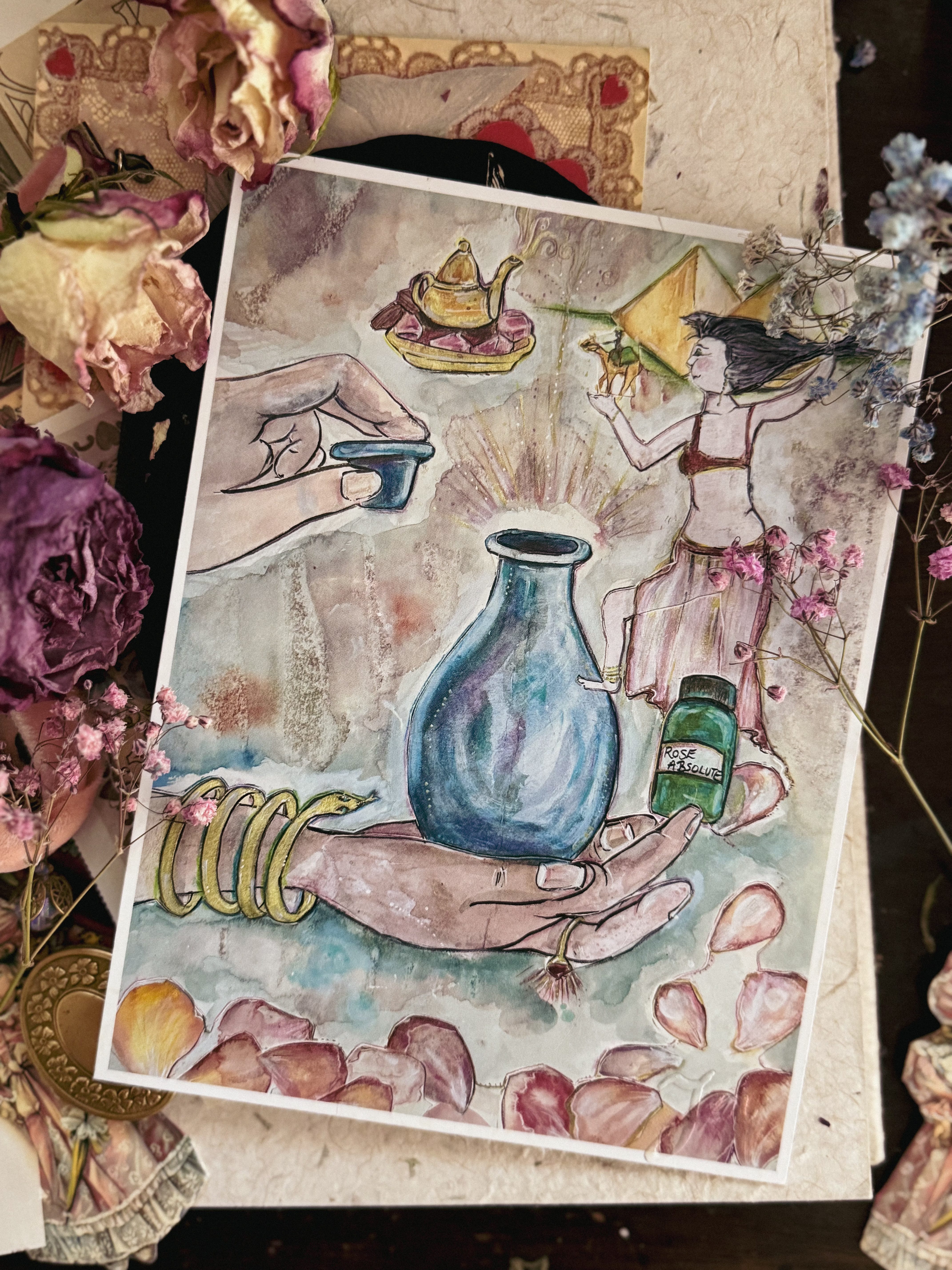 I like to pull oracle cards over my sketchbook, collages, and channeled artwork. I burn mugwort and ask Hecate to intercede on my behalf, as a herald who crosses over the threshold to bring forth cards that illuminate the shadow parts of the work I’m doing.