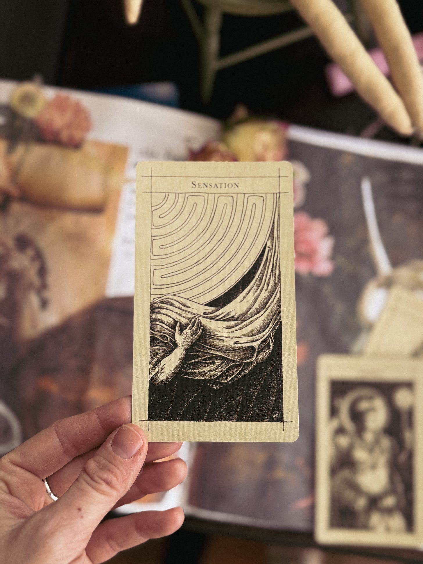 This card, Sensation, reminded me that sensation is a form of consciousness. To become more aware and feel more attuned, grounded, and alive, I need to connect with all my senses. Now more than ever, Sensation calls to us to break from isolation and reach for something that you can actually hold in your hands.